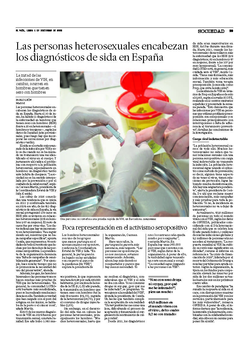 En España, los esfuerzos realizados en la prevención del VIH han sido insuficientes y, desde el año 2000, su incidencia permanece estable, por encima de la media europea. Se estima que en España viven entre 130.000 y 160.000 personas con VIH; de ellas, el 18% desconoce estar infectado y la mitad recibe el diagnóstico de forma tardía, lo que conlleva peor evolución, menor esperanza y calidad de vida, y mayores costes. El retraso diagnóstico es mayor en heterosexuales, usuarios de drogas inyectadas, mayores de 50 años e inmigrantes, mientras que los hombres que tienen sexo con hombres son el único grupo donde aumentan los nuevos diagnósticos. Se estima que hasta el 34% de las personas con VIH presentan carga viral detecta-ble, principalmente debido a barreras que dificultan su diagnóstico, como el insuficiente acceso a la prueba y la baja percepción del riesgo tanto por personas que desconocen estar infectadas como por los profesionales.