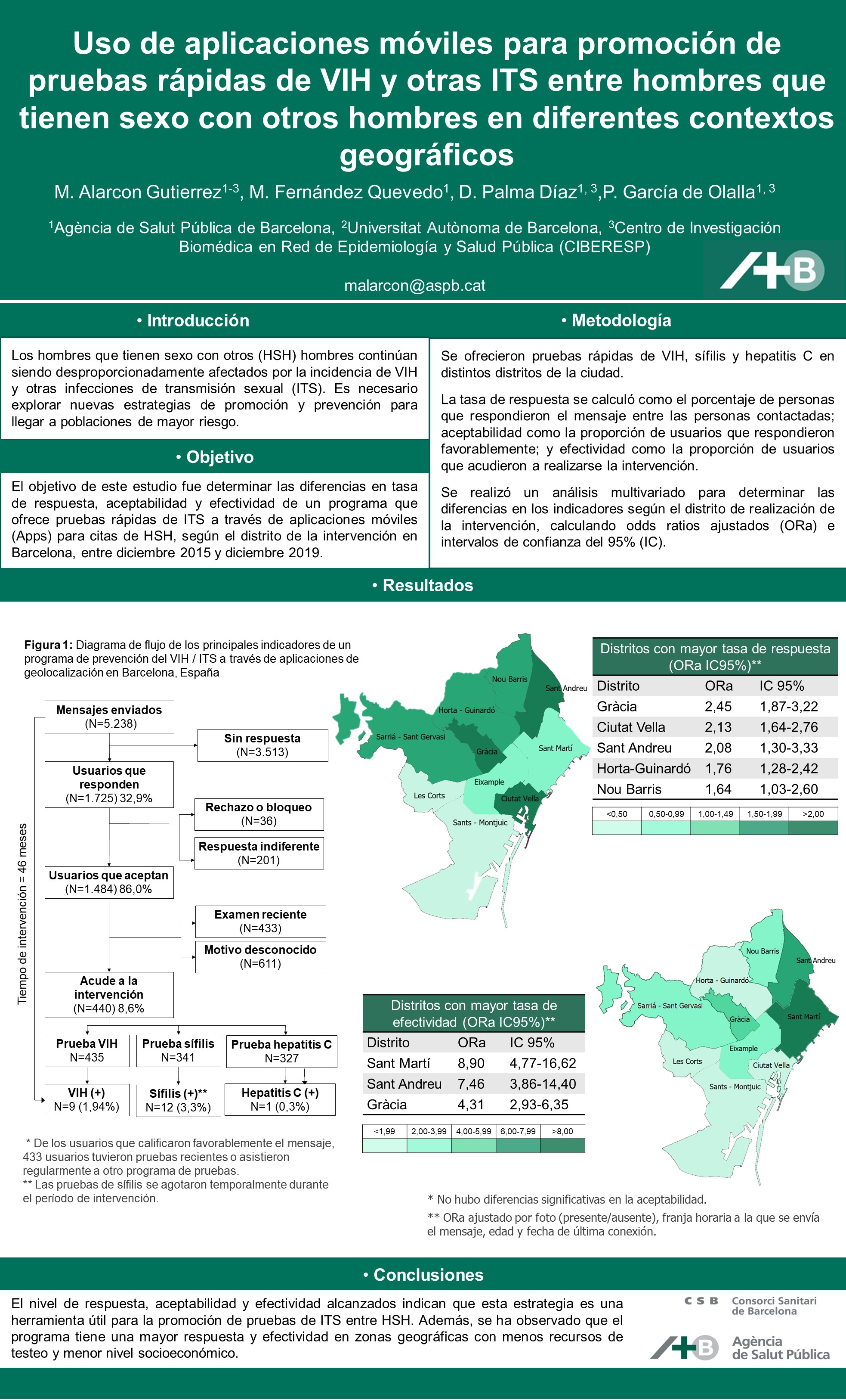 Introducción: Gais, bisexuales y otros hombres que tienen sexo con otros hombres (GBHSH) están desproporcionadamente afectados por el VIH y otras infecciones de transmisión sexual (ITS). Es necesario explorar nuevas estrategias de promoción y prevención para acceder a esta población. Objetivo: Determinar las diferencias en la tasa de respuesta, aceptabilidad y efectividad de un programa que ofrece pruebas rápidas de VIH, sífilis y hepatitis C a través de aplicaciones móviles (apps) para citas de GBHSH, según distrito de intervención, en Barcelona. Métodos: La tasa de respuesta se calculó como la proporción de personas que respondieron al mensaje; aceptabilidad como la proporción de usuarios que respondieron favorablemente; y efectividad como la proporción de usuarios que acudieron a realizarse la intervención. Se realizó un análisis multivariado para determinar diferencias en los indicadores según distrito de la intervención, calculando odds ratios ajustados (ORa) e intervalos de confianza del 95% (IC). Resultados: Se enviaron 5.238 mensajes. La tasa de respuesta fue 32,9% (N=1.725), la aceptabilidad 86,0% (N=1.484) y la efectividad 8,6% (N=480). Los distritos con mayor respuesta fueron Gràcia (ORa: 2,45; IC:1,87-3,22), Ciutat Vella (ORa: 2,13; IC:1,64-2,76), Sant Andreu (ORa: 2,08; IC:1,30-3,33), Horta-Guinardo (ORa: 1,76; IC:1,28-2,42) y Nou Barris (ORa: 1,64; IC:1,03-2,60). Aquellos con mayor efectividad fueron Sant Martí (ORa: 8,90; IC:4,77-16,62), Sant Andreu (ORa: 7,46; IC:3,86-14,40) y Gràcia (ORa: 4,31; IC:2,93-6,35). Conclusiones: La respuesta, aceptabilidad y efectividad alcanzadas indican que esta estrategia es una herramienta útil para acceder a la población GBHSH. Con mayor respuesta y efectividad en distritos con menos recursos de testeo y menor nivel socioeconómico.