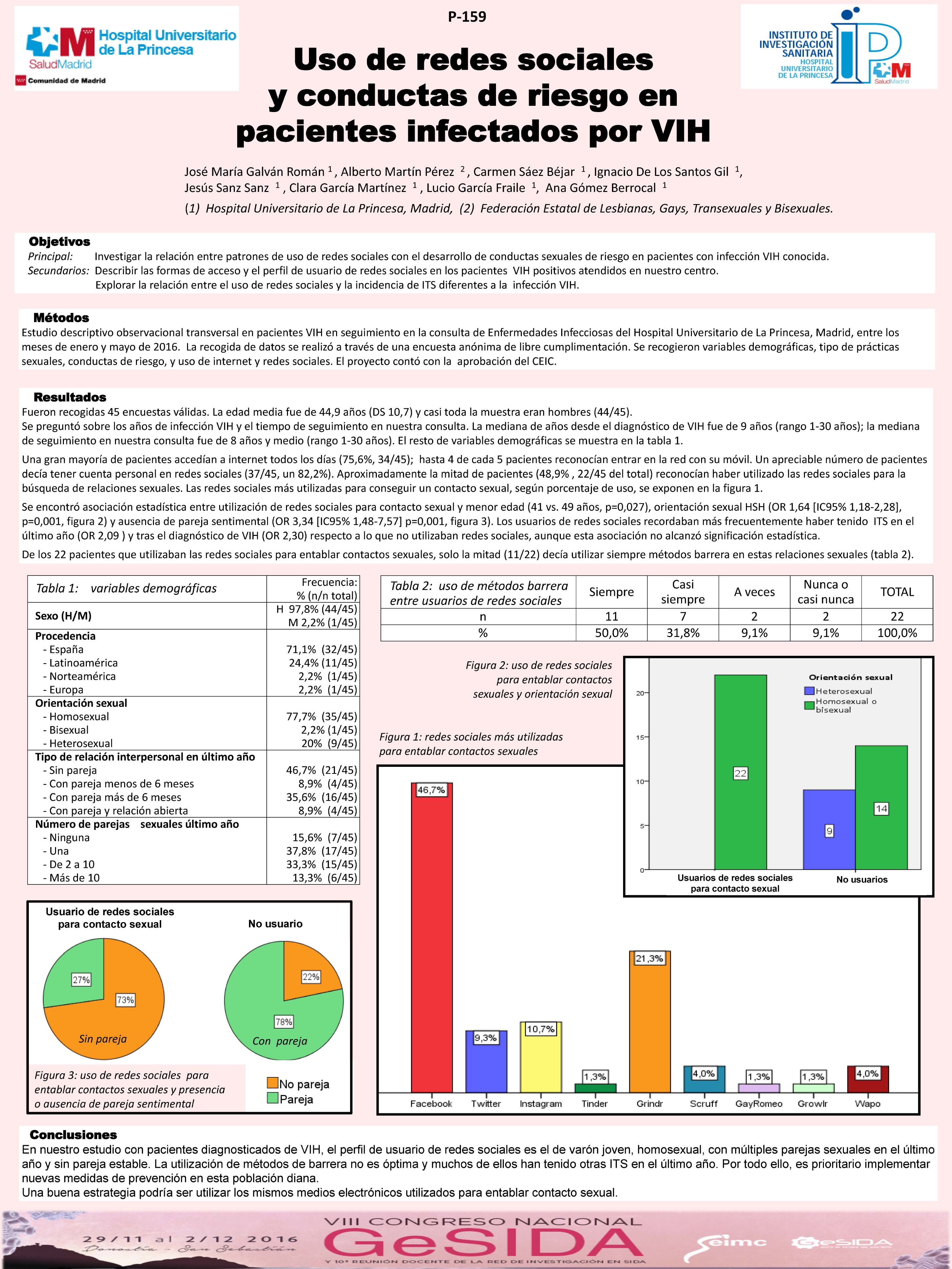 Introducción y objetivos: La manera de relación interpersonal ha cambiado desde la incorporación de Internet y las redes sociales, facilitando posiblemente el contacto físico entre usuarios. Algunos investigadores están estudiando si la utilización de redes sociales por personas de grupos vulnerables puede estar cambiando el tipo de prácticas sexuales. El objetivo principal del estudio ha sido investigar la relación entre el uso de redes sociales y el desarrollo de conductas sexuales de riesgo en pacientes VIH. Otros objetivos han sido la descripción del perfil de usuario de redes sociales para contacto sexual entre los pacientes VIH y la incidencia de ITS en este grupo. Material y Métodos: Estudio descriptivo observacional transversal en pacientes VIH en seguimiento en Enfermedades Infecciosas del Hospital Universitario de La Princesa, Madrid. La recogida de datos se realizó a través de encuesta anónima de libre cumplimentación. Se incluyeron variables demográficas, tipo de prácticas sexuales, conductas de riesgo, y uso de internet y redes sociales. Resultados: Se recogieron 45 encuestas válidas. La edad media fue de 44,93 años (DS, 10.7), casi todos hombres (44/45). La orientación sexual mayoritaria era la homosexual (77.7%) y la procedencia más frecuente la española (71.2%). Más de 3 de cada 4 utilizaba internet todos los días (75.6%) y muchos tenían cuenta en diferentes redes sociales (82.2%). La mitad de los pacientes reconocían haber utilizado las redes para mantener relaciones sexuales (48.9%, 22/45). Se encontró asociación estadística entre utilización de redes sociales para contacto sexual y menor edad (41 vs. 49 años, p=0.027), orientación sexual HSH (OR 1.64 [IC95% 1.18-2.28], p=0.001) y ausencia de pareja sentimental (OR 3.34 [IC95% 1.48-7.57], p=0.001). Estos pacientes recordaban haber tenido ITS en el último año y tras el diagnóstico de VIH con más frecuencia que aquellos que no utilizaban redes sociales, aunque esta asociación no alcanzó significación estadística. Sólo el 50% de estos pacientes (11/22) decía utilizar métodos de barrera en todas sus relaciones sexuales. Discusión y conclusión: En algunos colectivos en riesgo está en auge la utilización de redes sociales para mantener encuentros sexuales. En nuestro estudio, el perfil de usuario de redes sociales era el de varón jóven HSH, con gran número de parejas sexuales en el último año. La utilización de métodos de barrera en este grupo no era óptima, y muchos de ellos reconocían haber tenido otras ITS en el último año. Es prioritario implementar nuevas medidas de prevención en este grupo vulnerable.