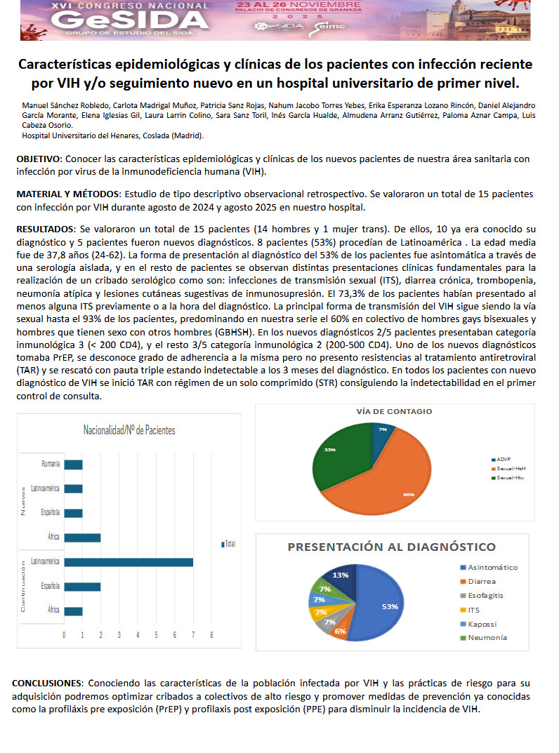 - Póster presentado en el XXII Congreso Nacional de la SEIMC (Sociedad Española de Enfermedades Infecciosas y Microbiología Clinica) celebrado del 24 al 26 de mayo de 2018 en Bilbao (España).