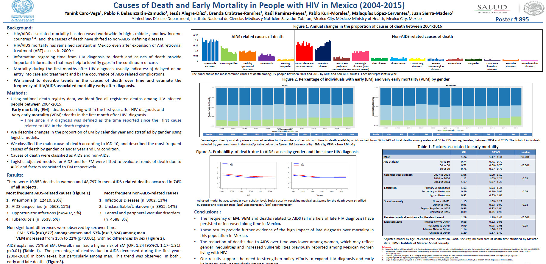 Objetivo. Analizar la distribución y tendencias de la mor¬talidad por VIH en las jurisdicciones sanitarias (JS) de México. Material y métodos. Se calcularon las tasas estandariza¬das de mortalidad utilizando las cifras oficiales de defunciones (Instituto Nacional de Estadística y Geografía) y estimaciones de población (Consejo Nacional de Población). Se analizó la magnitud, distribución y tendencias de la mortalidad por VIH a nivel nacional, por entidad federativa y JS utilizando el modelo de regresión JoinPoint. Resultados. De 2008 a 2015, la mortalidad por VIH disminuyó más de 20%. En las 25 JS con mayor mortalidad por VIH reside 11% de la población nacional, pero concentra 28.6% de las muertes, con el doble o triple de la mortalidad nacional. Conclusiones. Se identifi¬caron las 25 JS en donde deben focalizarse las acciones para reducir la mortalidad por VIH. Por primera vez se analizó un problema de salud en todas las JS mexicanas.