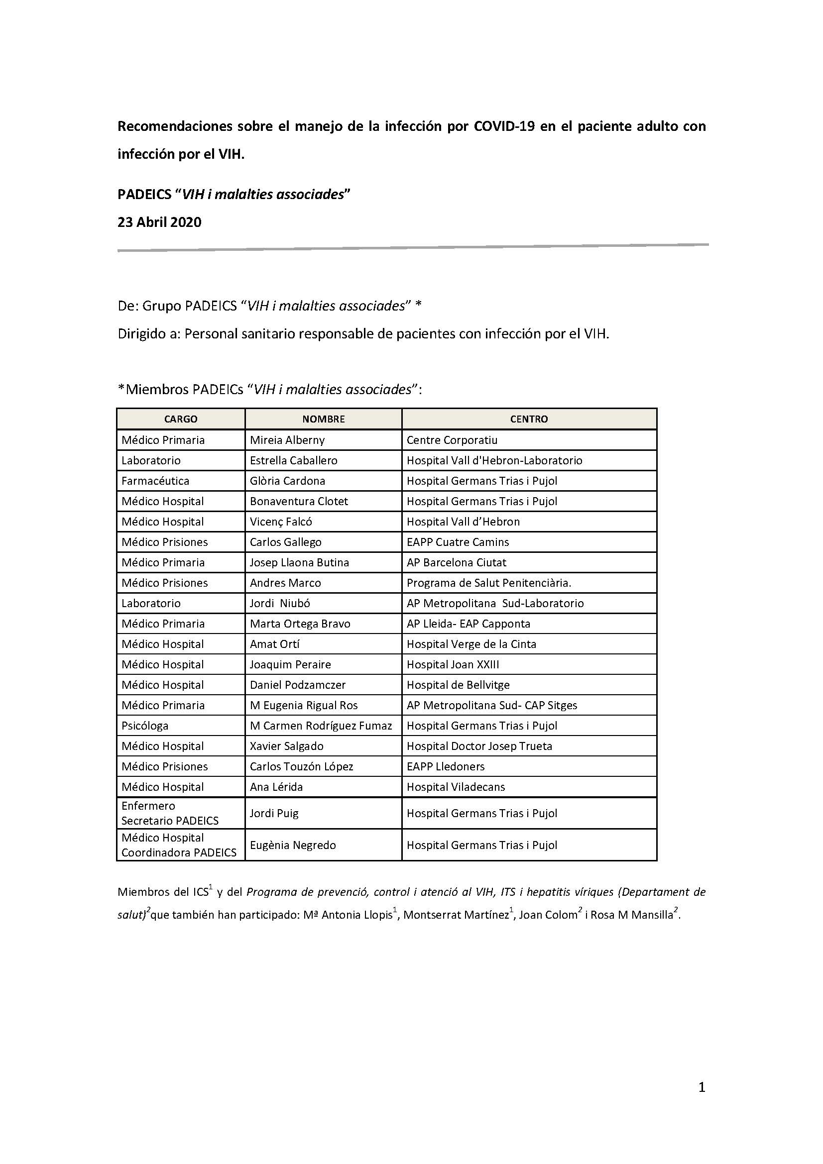 Recomendaciones sobre el manejo de la infección por COVID-19 en el paciente adulto con infección por el VIH