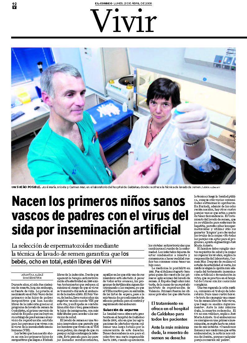 Nacen los primeros niños sanos vascos de padres con el virus del sida por inseminación artificial.- Tema: