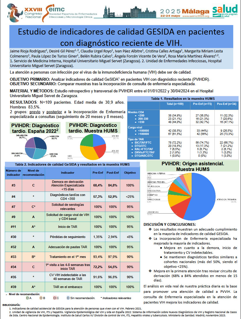 - Póster presentado en el XXVII Congreso Nacional de la SEIMC (Sociedad Española de Enfermedades Infecciosas y Microbiología Clínica) celebrado en Zaragoza del 30 de mayo al 1 de junio de 2024.