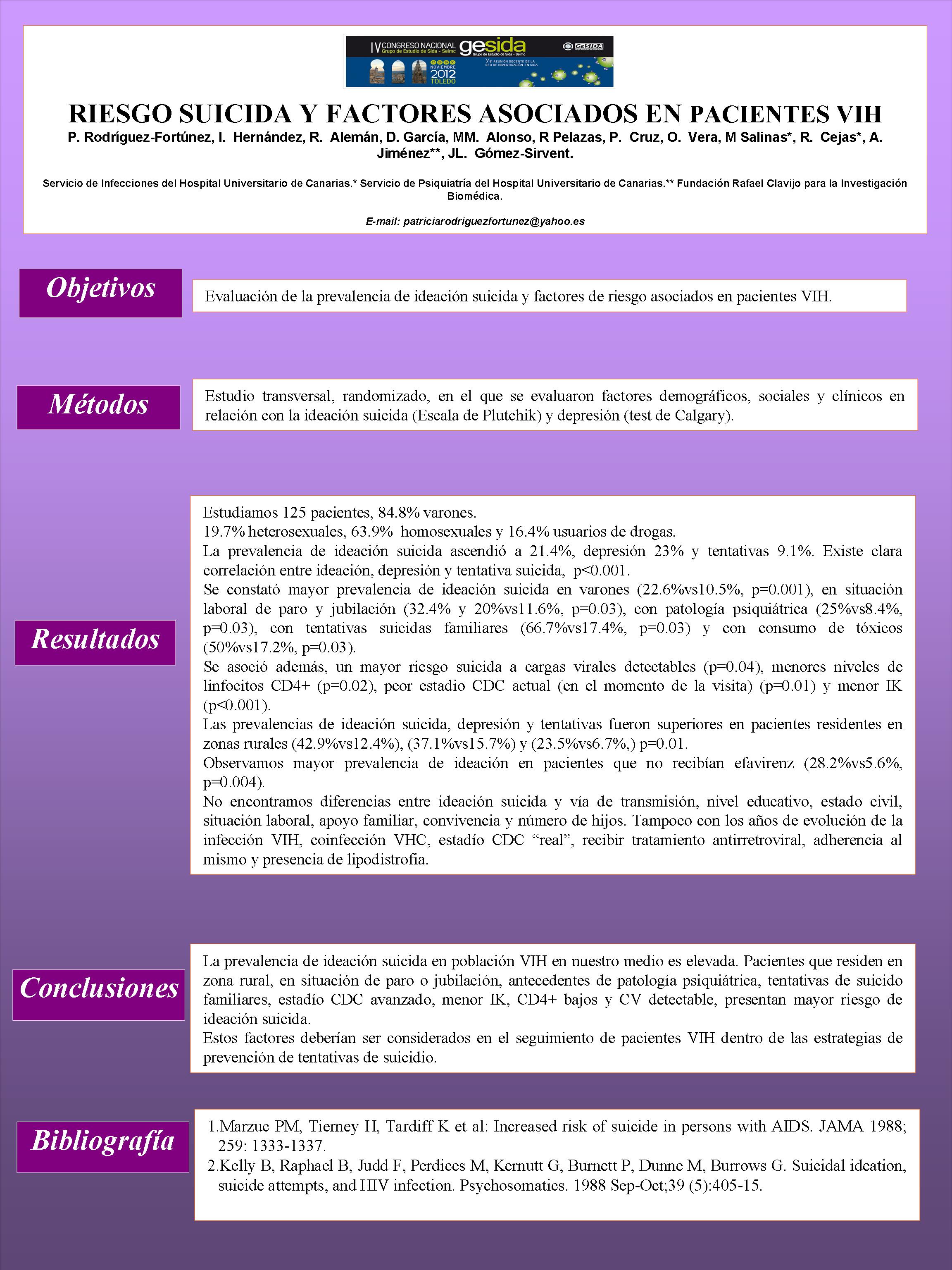 Método : Estudio transversal, randomizado, en el que se evaluaron factores demográficos (edad, sexo, vía de contagio del VIH, residencia rural/urbana), sociales (situación laboral, estado civil, nivel educativo, convivencia, apoyo familiar), analíticos (carga viral VIH (CV), linfocitos CD4+, serología VHC) y clínicos (enfermedades psicológicas previas, tratamiento psicológico, tentativas de suicidio previas, tentativas familiares de suicidio, años de diagnóstico VIH, presencia de tratamiento antirretroviral, adherencia, consumo de tóxicos, lipodistrofia, índice de Karnofsky (IK), estadío CDC “real” y “actual” (en el momento de la visita). Se utilizaron el “test de Calgary” para evaluar depresión y la “Escala de Plutchik” para ideación suicida. Resultados: Estudiamos 125 pacientes, 84.8% varones. El 19.7% presentaba vía de contagio heterosexual, 63.9% homosexual y 16.4% usuarios de drogas vía parenteral. La prevalencia de ideación suicida ascendió al 21.4%, depresión 23% y tentativas 9.1%. Se observó una clara correlación entre ideación, depresión y tentativa suicida, p<0.001. Se constató mayor prevalencia de ideación suicida en varones (22.6%vs10.5%, p=0.001), en situación laboral de paro y jubilación (32.4% y 20%vs11.6%, p=0.03), con patología psiquiátrica (25%vs8.4%, p=0.03), con tentativas suicidas familiares (66.7%vs17.4%, p=0.03) y con consumo de tóxicos (50%vs17.2%, p=0.03). Se asoció además, un mayor riesgo suicida a pacientes con carga viral detectable (p=0.04), menores niveles de CD4+ (p=0.02), peor estadío CDC actual (p=0.01) y menor IK (p<0.001). Las prevalencias de ideación suicida, depresión y tentativas fueron superiores en pacientes residentes en zonas rurales (42.9%vs12.4%), (37.1%vs15.7%) y (23.5%vs6.7%,) p=0.01. Observamos una prevalencia de ideación suicida mayor en pacientes que no recibían efavirenz (28.2%vs5.6%, p=0.004). No encontramos diferencias significativas entre ideación suicida y la vía de transmisión, nivel educativo, estado civil, situación laboral, apoyo familiar, convivencia y número de hijos. Tampoco con los años de evolución de la infección por VIH, coinfección VHC, estadío CDC “real”, recibir tratamiento antirretroviral, adherencia al mismo y presencia de lipodistrofia. Conclusión: La prevalencia de ideación suicida en población VIH de nuestro medio es elevada y similar a la encontrada en condiciones psiquiátricas severas.