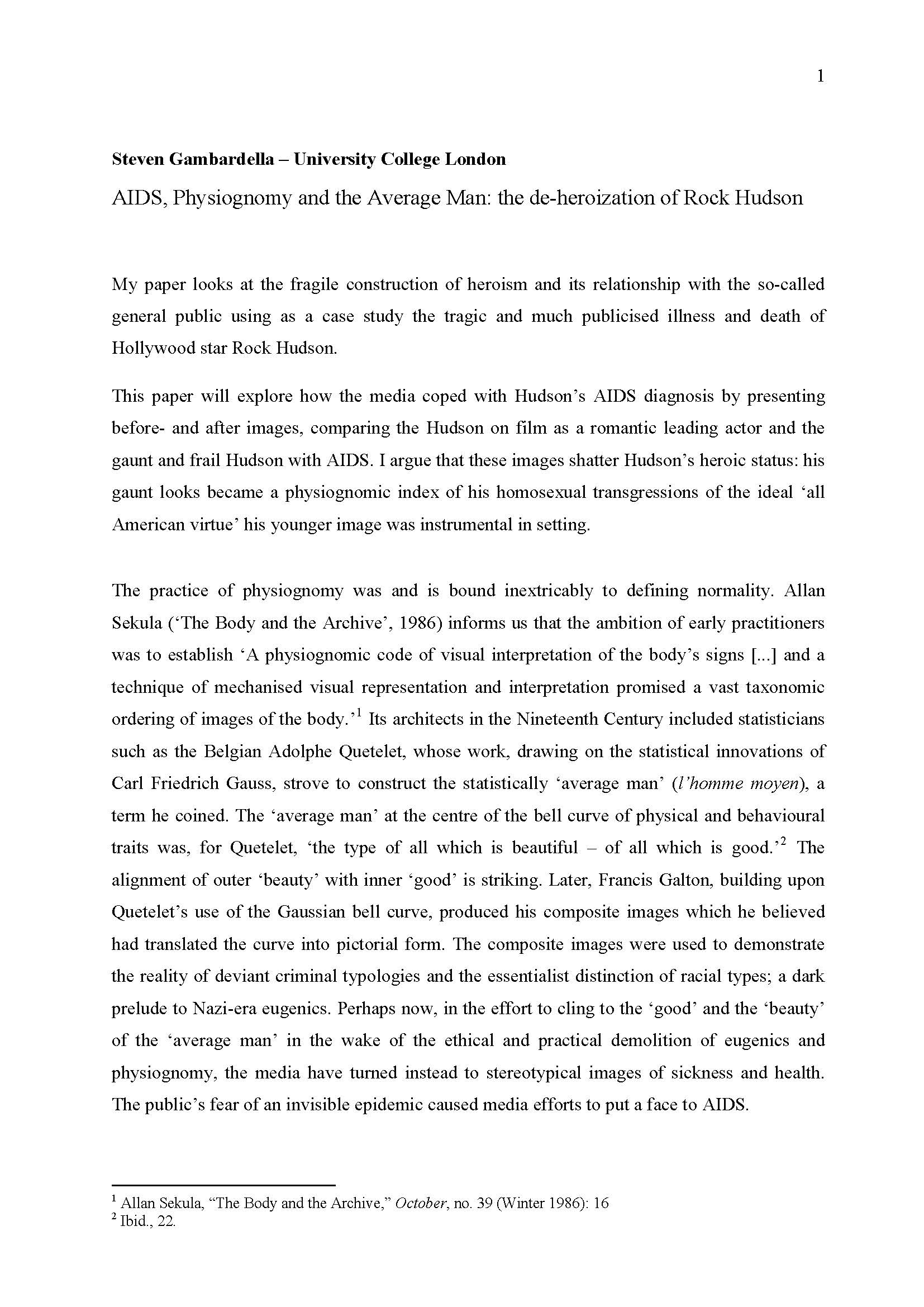 My paper looks at the fragile construction of heroism and its relationship with the so-called general public using as a case study the tragic and much publicised illness and death of Hollywood star Rock Hudson. This paper will explore how the media coped with Hudson’s AIDS diagnosis by presenting