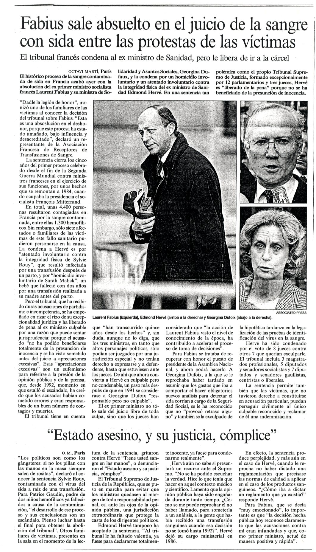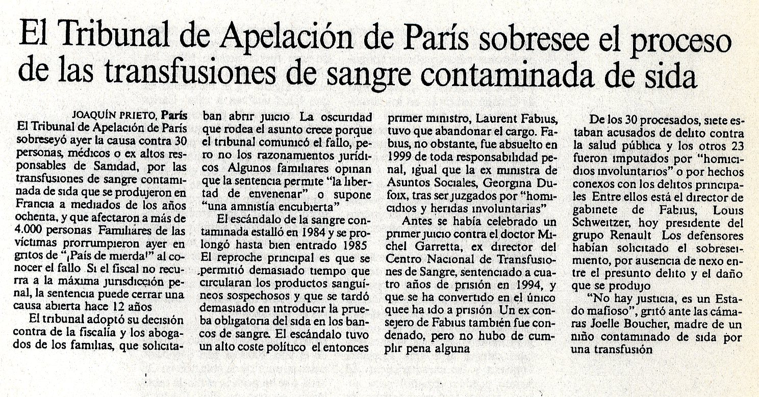 El Tribunal de Apelación de París sobresee el proceso de las transfusiones de sangre contaminada de sida